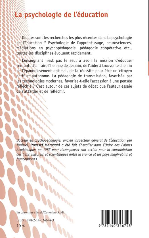 Quelles sont les recherches les plus récentes dans la psychologie de l'éducation ? Psychologie de l'apprentissage, neurosciences, médiations en psychopédagogie, pédagogie coopérative etc., toutes les disciplines évoluent rapidement. L'enseignant n'est pas le seul à avoir la mission d'éduquer l'enfant, d'en faire l'homme de demain, de l'aider à trouver le chemin de l'épanouissement optimal, de la réussite pour être un citoyen actif et autonome. La pédagogie de transmission, favorisée par les technologies modernes, favorise-telle l'accession à une pensée réfléchie ? C'est autour de ces sujets de débat que l'auteur essaie de s'attarder et de réfléchir.