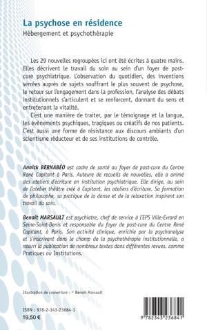 Les 29 nouvelles regroupées ici ont été écrites à quatre mains. Elles décrivent le travail du soin au sein d'un foyer de post-cure psychiatrique. L'observation du quotidien, des inventions serrées auprès de sujets souffrant le plus souvent de psychose, le retour sur l'engagement dans la profession, l'analyse des débats institutionnels s'articulent et se renforcent, donnant du sens et entretenant la vitalité. C'est une manière de traiter, par le témoignage et la langue, les événements psychiques, tragiques ou créatifs de nos patients. C'est aussi une forme de résistance aux discours ambiants d'un scientisme réducteur et de ses institutions de contrôle
