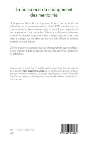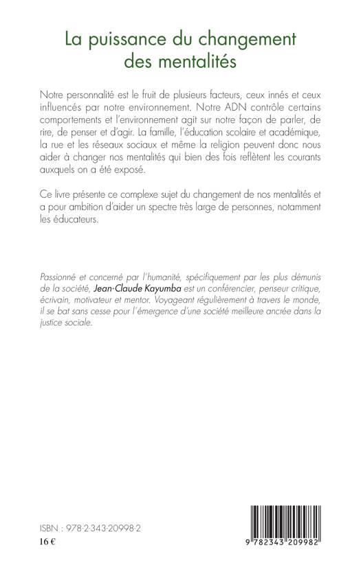 Notre personnalité est le fruit de plusieurs facteurs, ceux innés et ceux influencés par notre environnement. Notre ADN contrôle certains comportements et l'environnement agit sur notre façon de parler, de rire, de penser et d'agir. La famille, l'éducation scolaire et académique, la rue et les réseaux sociaux et même la religion peuvent donc nous aider à changer nos mentalités qui bien des fois reflètent les courants auxquels on a été exposé. Ce livre présente ce complexe sujet du changement de nos mentalités et a pour ambition d'aider un spectre très large de personnes, notamment les éducateurs.
