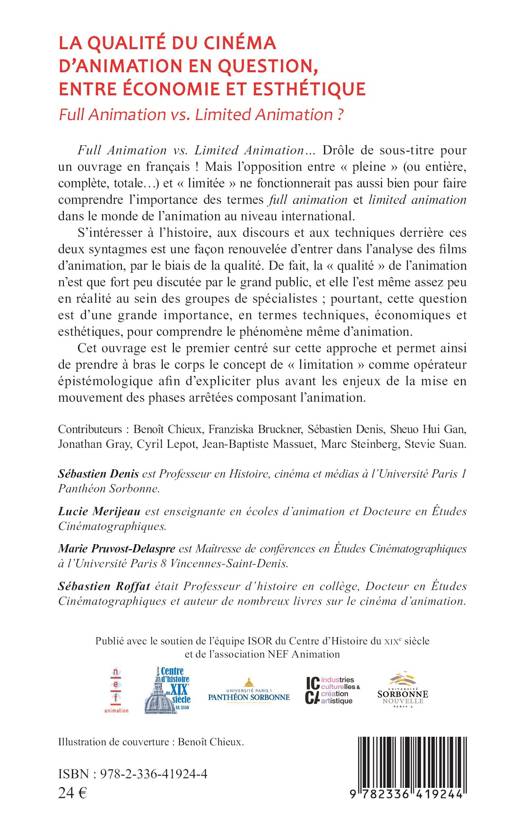 Full Animation vs. Limited Animation… Drôle de sous-titre pour un ouvrage en français ! Mais l’opposition entre « pleine » (ou entière, complète, totale…) et « limitée » ne fonctionnerait pas aussi bien pour faire comprendre l’importance des termes full animation et limited animation dans le monde de l’animation au niveau international. S’intéresser à l’histoire, aux discours et aux techniques derrière ces deux syntagmes est une façon renouvelée d’entrer dans l’analyse des films d’animation, par le biais de la qualité. De fait, la « qualité » de l’animation n’est que fort peu discutée par le grand public, et elle l’est même assez peu en réalité au sein des groupes de spécialistes ; pourtant, cette question est d’une grande importance, en termes techniques, économiques et esthétiques, pour comprendre le phénomène même d’animation. Cet ouvrage est le premier centré sur cette approche et permet ainsi de prendre à bras le corps le concept de « limitation » comme opérateur épistémologique afin d’expliciter plus avant les enjeux de la mise en mouvement des phases arrêtées composant l’animation.