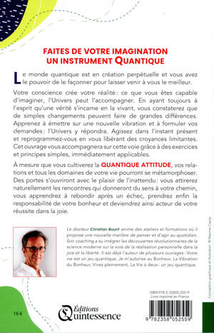 Le monde quantique est en création perpétuelle et vous avez le pouvoir de le façonner pour laisser venir à vous le meilleur. Votre conscience crée votre réalité : ce que vous êtes capable d'imaginer, l'Univers peut l'accompagner. En ayant toujours à l'esprit qu'une vérité s'incarne en la vivant, vous constaterez que de simples changements peuvent faire de grandes différences. Apprenez à émettre sur une nouvelle vibration et à formuler vos demandes : l'Univers y répondra. Agissez dans l'instant présent et reprogrammez-vous en vous libérant des croyances limitantes. Cet ouvrage vous accompagnera sur cette voie grâce à des exercices et principes simples, immédiatement applicables. À mesure que vous cultiverez la Quantique Attitude, vos relations et tous les domaines de votre vie pourront se métamorphoser. Des portes s'ouvriront avec le plaisir de l'inattendu : vous attirerez naturellement les rencontres qui donneront du sens à votre chemin, vous apprendrez à rebondir après un échec, prendrez enfin la responsabilité de votre bonheur et deviendrez ainsi acteur de votre réussite dans la joie.