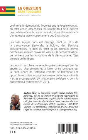Le drame fondamental du Togo est que le Peuple togolais, en l'état actuel des choses, ne saurait, tout seul, qu'avec des bulletins de vote, sortir de la dictature ethno-militaro-clanique plus que cinquantenaire des Gnassingbé. Les faits relatés dans cet ouvrage, dont le refus de la transparence électorale, le hold-up des élections présidentielles, le déni du droit et les entraves graves portées à la mise en oeuvre de la loi sur la décentralisation, démontrent que les fondations de la démocratie et l'État de droit s'effondrent. Le pouvoir en place ne semble guère préoccupé par les appels au changement et à l'alternance politique qui lui sont lancés de l'intérieur comme de l'extérieur. Cet opuscule constitue la suite des travaux de l'auteur intitulés Écrits circonstanciels de militantisme politique, dont la publication a commencé en 2014.