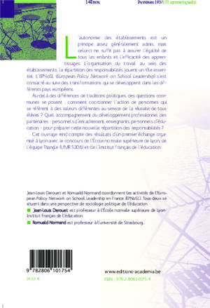 L'autonomie des établissements est un principe admis, mais il ne suffit pas à assurer l'égalité de tous les enfants et l'efficacité des apprentissages. L'organisation du travail au sein des établissements, la répartition des responsabilités jouent un rôle essentiel. L'EPNoSL (European Policy Network on School Leadership) s'est consacré au suivi des transformations qui se développent dans les différents pays européens. Au-delà des différences de traditions politiques, des questions communes se posent.