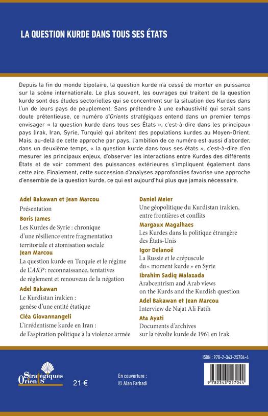 Depuis la fin du monde bipolaire, la question kurde n’a cessé de monter en puissance sur la scène internationale. Le plus souvent, les ouvrages qui traitent de la question kurde sont des études sectorielles qui se concentrent sur la situation des Kurdes dans l’un de leurs pays de peuplement. Sans prétendre à une exhaustivité qui serait sans doute prétentieuse, ce numéro d’Orients stratégiques entend dans un premier temps envisager « la question kurde dans tous ses États », c’est-à-dire dans les principaux pays (Irak, Iran, Syrie, Turquie) qui abritent des populations kurdes au Moyen-Orient. Mais, au-delà de cette approche par pays, l’ambition de ce numéro est aussi d’aborder, dans un deuxième temps, « la question kurde dans tous ses états », c’est-à-dire d’en mesurer les principaux enjeux, d’observer les interactions entre Kurdes des différents États et de voir comment des puissances extérieures s’impliquent également dans cette aire. Finalement, cette succession d’analyses approfondies favorise une approche d’ensemble de la question kurde, ce qui est aujourd’hui plus que jamais nécessaire.