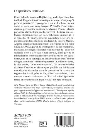 Ces articles de Yassin al-Haj Saleh, grande figure intellectuelle de l'opposition démocratique syrienne, n'ont jusqu'à présent jamais été regroupés en un seul volume, ni en arabe ni dans une autre langue. Précédés d'une introduction précisant le contexte de chacun d'eux et classés par ordre chronologique, ils couvrent l'histoire du soulèvement syrien depuis son déclenchement en mars 2011 et constituent l'analyse interne la plus fine de cet événement majeur dans l'histoire moderne du Proche-Orient. Analyse originale non seulement du régime né du coup d'État de 1970, à partir de ses slogans et de ses emblèmes, mais aussi des origines sociales et culturelles de l'extrême violence dont il a toujours fait preuve, ainsi que de la militarisation du soulèvement et de l'intrusion des djihadistes, qui, en se conjuguant, ont abouti à ce que l'auteur désigne comme le "nihilisme guerrier". Le dernier texte, le plus dense, "Le sultan moderne", fait la synthèse des dizaines d'articles et chroniques publiés par lui durant une dizaine d'années dans la presse sur la nature du régime des Assad, père et fils, alliant despotisme, communautarisme, clanisme en un "État sultanien" (par référence entre autres aux mamelouks) de type nouveau.