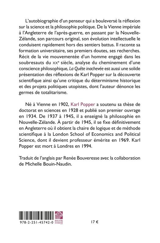 L’autobiographie d’un penseur qui a bouleversé la réflexion sur la science et la philosophie politique. De la Vienne impériale à l’Angleterre de l’après-guerre, en passant par la Nouvelle- Zélande, son parcours original, son évolution intellectuelle le conduisent rapidement hors des sentiers battus. Il raconte sa formation universitaire, ses premiers doutes, ses recherches. Récit de la vie mouvementée d’un homme engagé dans les soubresauts du XXe siècle, analyse du cheminement d’une conscience philosophique, La Quête inachevée est aussi une solide présentation des réflexions de Karl Popper sur la découverte scientifique ainsi qu’une critique du déterminisme historique et des projets politiques utopistes, dont l’auteur dénonce les germes de totalitarisme.