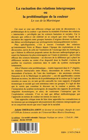 Cette réflexion critique tente de déconstruire " la problématique de la couleur " qui domine la modalité d'écriture des relations " interraciales " privilégié par les sciences humaines et sociales. Les relations interraciales entre Blancs descendants des colons et Noirs descendants d'esclaves, des anciennes colonies françaises et Martinique en particulier, ont été appréhendées comme illustrant au mieux les dérives de la problématique de la couleur en tant qu'elle camoufle les vrais rapports d'inégalité économique et sociale qui sont entretenus entre ces groupes.