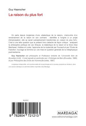 On parle depuis longtemps d'une "dialectique de la raison", c'est-à-dire d'un renversement de la raison en son contraire: identifiée à l'origine à un projet d'émancipation, elle se serait subrepticement transformée en "raison du plus fort". C'est à une telle question que le présent livre s'attache de façon critique: analysant la philosophie politique de Leo Strauss, la dialectique de la raison et la force chez Machiavel, Hobbes et Locke, l'approche de la modernité par Foucault et par l'École de Francfort, l'ouvrage se termine sur une mise en question générale de la métaphysique post-kantienne.