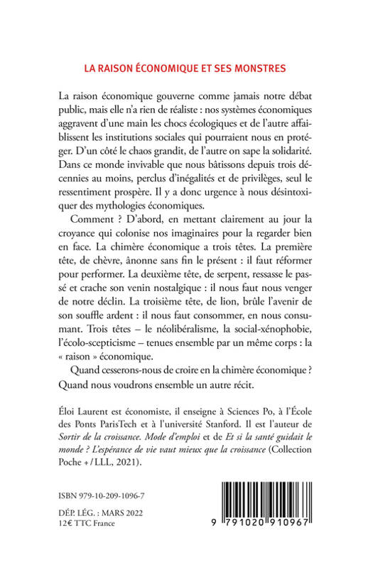 La raison économique gouverne comme jamais notre débat public, mais elle n'a rien de réaliste : nos systèmes économiques aggravent d'une main les chocs écologiques et de l'autre affaiblissent les institutions sociales qui pourraient nous en protéger. D'un côté le chaos grandit, de l'autre on sape la solidarité. Dans ce monde invivable que nous bâtissons depuis trois décennies au moins, perclus d'inégalités et de privilèges, seul le ressentiment prospère. Il y a donc urgence à nous désintoxiquer des mythologies économiques. Comment ? D'abord, en mettant clairement au jour la croyance qui colonise nos imaginaires pour la regarder bien en face. La chimère économique a trois têtes. La première tête, de chèvre, ânonne sans fin le présent : il faut réformer pour performer. La deuxième tête, de serpent, ressasse le passé et crache son venin nostalgique : il nous faut nous venger de notre déclin. La troisième tête, de lion, brûle l'avenir de son souffle ardent : il nous faut consommer, en nous consumant. Trois têtes - le néolibéralisme, la social-xénophobie, l'écolo-scepticisme - tenues ensemble par un même corps : la « raison » économique. Quand cesserons-nous de croire en la chimère économique ? Quand nous voudrons ensemble un autre récit.