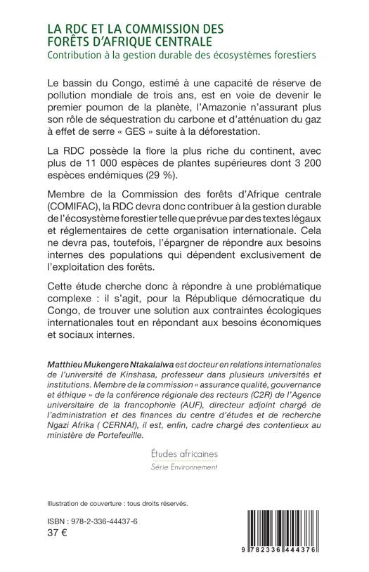 Le bassin du Congo, estimé à une capacité de réserve de pollution mondiale de trois ans, est en voie de devenir le premier poumon de la planète, l'Amazonie n'assurant plus son rôle de séquestration du carbone et d'atténuation du gaz à effet de serre GES suite à la déforestation. La RDC possède la flore la plus riche du continent, avec plus de 11 000 espèces de plantes supérieures dont 3 200 espèces endémiques (29 %). Membre de la Commission des forêts d'Afrique centrale (COMIFAC), la RDC devra donc contribuer à la gestion durable de l'écosystème forestier telle que prévue par des textes légaux et réglementaires de cette organisation internationale. Cela ne devra pas, toutefois, l'épargner de répondre aux besoins internes des populations qui dépendent exclusivement de l'exploitation des forêts. Cette étude cherche donc à répondre à une problématique complexe: il s'agit, pour la République démocratique du Congo, de trouver une solution aux contraintes écologiques internationales tout en répondant aux besoins économiques et sociaux internes.