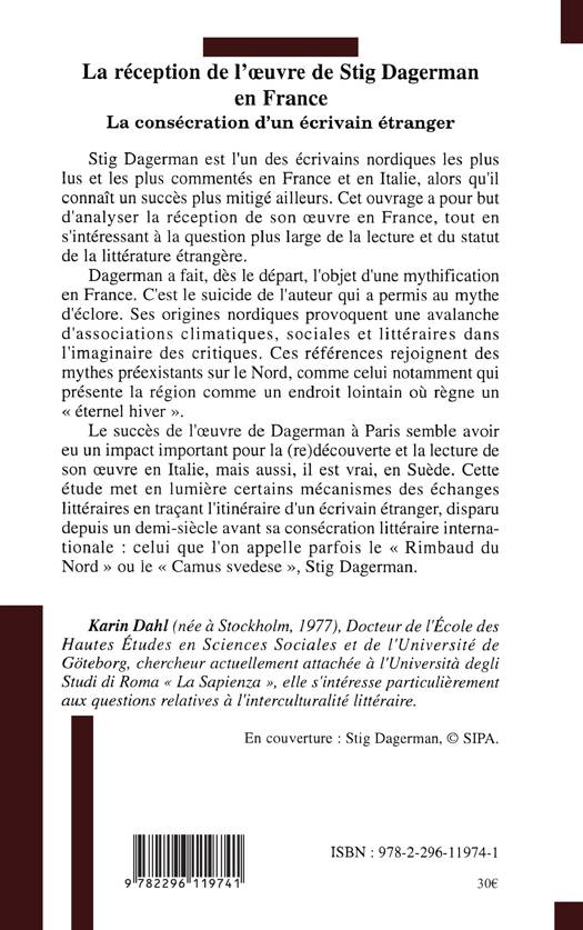 Stig Dagerman est l'un des écrivains nordiques les plus lus et les plus commentés en France et en Italie, alors qu'il connaît un succès plus mitigé ailleurs. Cet ouvrage a pour but d'analyser la réception de son oeuvre en France, tout en s'intéressant à la question plus large de la lecture et du statut de la littérature étrangère. L'auteur met en lumière certains mécanismes des échanges littéraires en traçant l'itinéraire d'un écrivain étranger, disparu depuis un demi-siècle avant sa consécration littéraire internationale, celui qu'on appelle parfois le "Rimbaud du Nord".