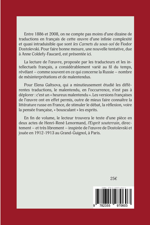 Les Carnets du sous-sol sont sans conteste l'un des textes les plus complexes de Fiodor Dostoïevski et celui qui a connu le plus grand succès en France où il a bénéficié de nombreuses traductions. Le présent ouvrage en propose, au demeurant, une nouvelle. Si la lecture de cette oeuvre faite par les traducteurs et les intellectuels français a considérablement varié au fil du temps, l'int érêt pour cette oeuvre ne s'est jamais démenti, bien que souvent fondé - comme fréquemment en ce qui concerne la Russie - sur des malentendus divers et variés. Pour Elena Galtsova, qui a minutieusement étudié les différentes traductions de cette oeuvre majeure, le malentendu, en l'occurrence, n'est pas à déplorer : c'est un « heureux malentendu », qui a permis - et permet encore - le dialogue, qui a stimulé - et stimule encore - la pensée des intellectuels français.