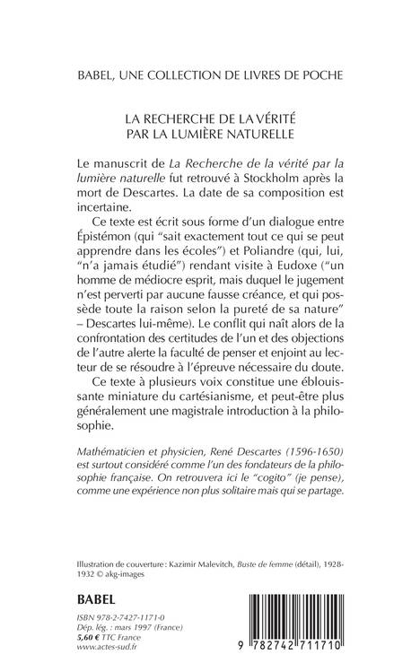 Un honnête homme n'est pas obligé d'avoir vu tous les livres, ni d'avoir appris soigneusement tout ce qui s'enseigne dans les écoles ; et même ce serait une espèce de défaut en son éducation, s'il avait trop employé son temps dans l'exercice des lettres. Il a beaucoup d'autres choses à faire pendant sa vie, le cours de laquelle doit être si bien mesuré qu'il lui en reste la meilleure partie pour pratiquer les bonnes actions, qui lui devraient être enseignées par sa propre raison, s'il n'apprenait rien que d'elle seule. (...) eudoxe. Je n'ai jamais eu le dessein de prescrire à qui que ce soit la méthode qu'il faut suivre dans la recherche de la vérité. J'ai voulu seulement exposer celle dont je me suis servi, afin que si on la juge mauvaise on la rejette, si au contraire bonne et utile d'autres s'en servent aussi.