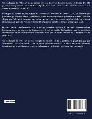 "La Recherche de l'Absolu" d'Honoré de Balzac est un roman qui explore les profondeurs de l'obsession scientifique et ses répercussions sur la vie familiale. L'histoire se déroule à Douai, dans une maison flamande traditionnelle, la Maison Claës, où Balthazar Claës, un homme autrefois séduisant et passionné par la chimie, se laisse absorber par sa quête de l'absolu. Cette recherche, qui le consume, le conduit à négliger sa famille, changeant sa femme Joséphine, une femme d'origine espagnole, dévouée mais tourmentée par l'indifférence croissante de son mari. Le roman dépeint avec une grande finesse psychologique les tensions entre l'aspiration à la connaissance et les responsabilités familiales. Balzac illustre comment la passion dévorante de Balthazar pour la science le pousse à ignorer les réalités quotidiennes et les besoins émotionnels de ses proches. À travers des descriptions détaillées et une analyse des transformations des personnages, Balzac met en lumière les sacrifices personnels et les désillusions qui accompagnent la poursuite d'un idéal inatteignable. Le roman est une réflexion sur les limites de l'évolution humaine et les conséquences de l'obsession sur les relations interpersonnelles.