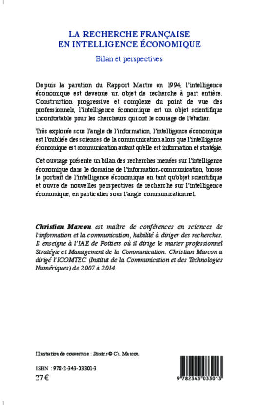 Cet ouvrage présente un bilan des recherches menées sur l'intelligence économique dans le domaine de l'information-communication, brosse le portrait de l'intelligence économique en tant qu'objet scientifique et ouvre de nouvelles perspectives de recherche sur l'intelligence économique, en particulier sous l'angle communicationnel.