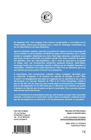 En septembre 2017, trois ouragans d’une violence exceptionnelle se sont abattus sur les Petites Antilles, dont le plus dévastateur, Irma, a causé des dommages considérables aux îles de Saint-Martin et de Saint-Barthélemy. Après les premières semaines consacrées à la gestion de l’urgence et à un retour progressif à la vie normale, les deux territoires ont débuté une phase de reconstruction, qui se voulait durable et exemplaire. La Cour formule des recommandations pour que, près de quatre ans après cette catastrophe naturelle, cette phase de reconstruction s’achève dans les meilleures conditions et pour que des enseignements en soient tirés si de tels phénomènes devaient se reproduire.