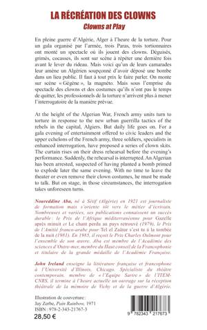 En pleine guerre d’Algérie, Alger à l’heure de la torture. Pour un gala organisé par l’armée, trois Paras, trois tortionnaires ont monté un spectacle où ils jouent des clowns. Déguisés, grimés, cocasses, ils sont sur scène à répéter une dernière fois avant le lever du rideau. Mais voici qu’un de leurs camarades leur amène un Algérien soupçonné d’avoir déposé une bombe dans un lieu public. Il faut à tout prix le faire parler. On monte sur scène « Gégène », la magnéto. Mais sous l’emprise du spectacle des clowns et des costumes qu’ils n’ont pas le temps de quitter, les professionnels de la torture n’arrivent plus à mener l’interrogatoire de la manière prévue. At the height of the Algerian War, French army units turn to torture in response to the new urban guerrilla tactics of the rebels in the capital, Algiers. But daily life goes on. For a gala evening of entertainment offered to civic leaders and the upper echelons of the French army, three soldiers, specialists in enhanced interrogation, have proposed a series of clown skits. The curtain rises on their dress rehearsal before the evening’s performance. Suddenly, the rehearsal is interrupted. An Algerian has been arrested, suspected of having planted a bomb primed to explode later the same evening. With no time to leave the theater or even remove their clown costumes, he must be made to talk. But on stage, in those circumstances, the interrogation takes unfores