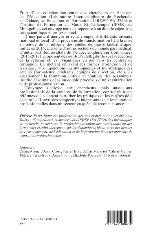 Fruit d'une collaboration entre des chercheurs en Sciences de l'éducation (Laboratoire Interdisciplinaire de Recherche en Didactique Education et Formation, LIRDEF EA 3749) et l'Institut de Formation en Masso-Kinésithérapie (IFMK) de Montpellier, cet ouvrage tente de répondre à un double enjeu, à la fois scientifique et professionnel. D'une part il analyse et rend compte, à différents niveaux d'un processus de transformation lié à la mise en œuvre de la réforme des études de masso-kinésithérapie. D'autre part, les résultats de l'étude conduite sur trois années (2015-1018), proposent des outils d'intelligibilité sur la réception de la réforme et les dynamiques en jeu dans les centres de formation.