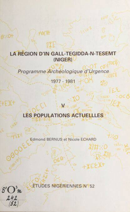 Le peuplement de la région d’In Gall-Tegidda-n-Tesemt s’est considérablement transformé au cours du temps. Dans ce tome V des recherches archéologiques d'urgence menées au Niger, sont rassemblées plusieurs interventions visant à mieux connaître les populations actuelles. Les trois grands chapitres sont donc les suivants : la pratique métallurgique de la population touareg et les traditions orales collectées à propos de l’histoire technique, puis les questions soulevées par les traces de métallurgies anciennes depuis le premier millénaire avant J.-C. ; les éleveurs nomades qui vivent dans la région d’In Gall-Tegidda-n-Tesemt et sont associés à de petites communautés sédentaires très anciennement implantées ; la réalité des Kel Fadey, longtemps considérés comme les principaux responsables de l’insécurité sur les routes et du pillage des caravanes.