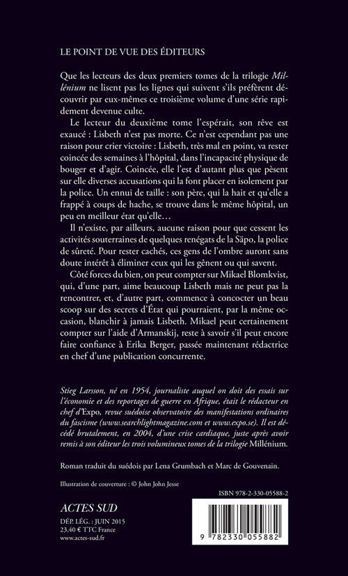 Que les lecteurs des deux premiers tomes de la trilogie «Millénium »ne lisent pas les lignes qui suivent s'ils préfèrent découvrir par eux-mêmes ce troisième volume d'une série rapidement devenue culte. Le lecteur du deuxième tome l'espérait, son rêve est exaucé : Lisbeth n'est pas morte. Ce n'est cependant pas une raison pour crier victoire : Lisbeth, très mal en point, va rester coincée des semaines à l'hôpital, dans l'incapacité physique de bouger et d'agir. Coincée, elle l'est d'autant plus que pèsent sur elle diverses accusations qui la font placer en isolement par la police. Un ennui de taille : son père, qui la hait et qu'elle a frappé à coups de hache, se trouve dans le même hôpital, un peu en meilleur état qu'elle...