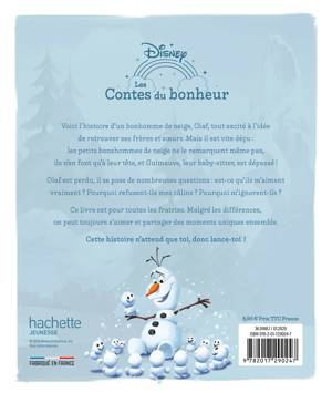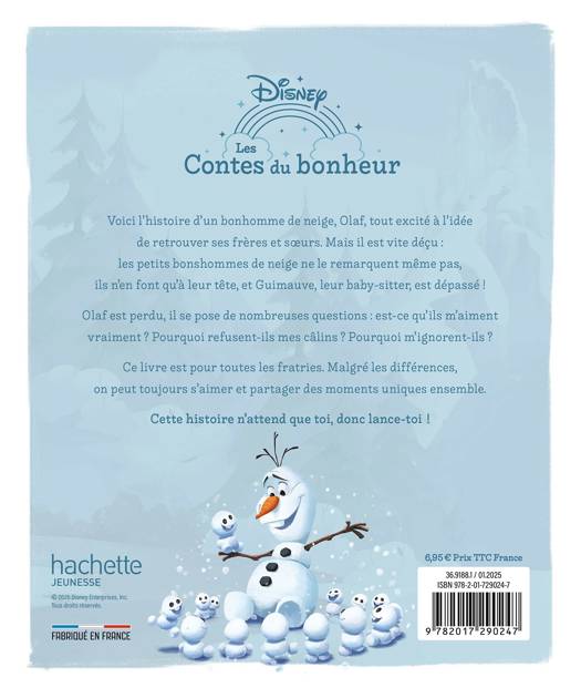 Résumé :Voici l’histoire d’un bonhomme de neige, Olaf, tout excité à l’idée de retrouver ses frères et sœurs. Mais il déchante vite en les rejoignant : les petits bonshommes de neige ne le remarquent pas, ils n’en font qu’à leur tête, et Guimauve, leur baby-sitter, est dépassé ! Olaf est perdu, il se pose de nombreuses questions : est-ce qu’ils m’aiment vraiment ? Pourquoi refusent-ils mes câlins ? Pourquoi m’ignorent-ils ? Ce livre est pour toutes les fratries. Même différents, cela n’empêche pas de s’aimer et de partager des moments uniques ensemble. Ce livre n’attend que toi, donc lance-toi !