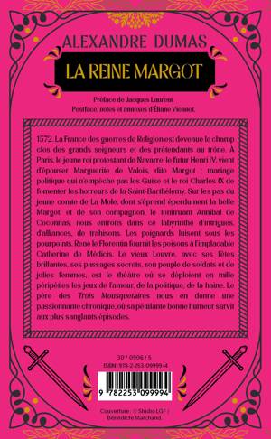 1572. La France des guerres de religion est devenue le champ clos des grands seigneurs et des prétendants au trône. A Paris, le jeune roi protestant de Navarre, le futur Henri IV, vient d'épouser Marguerite de Valois, dite Margot ; mariage politique qui n'empêche pas les Guise et le roi Charles IX de fomenter les horreurs de la Saint-Barthélemy. Sur les pas du jeune comte de La Mole, dont s'éprend éperdument la belle Margot, et de son compagnon, le tonitruant Annibal de Coconnas, nous entrons dans ce labyrinthe d'intrigues, d'alliances, de trahisons. Les poignards luisent sous les pourpoints. René le Florentin fournit les poisons à l'implacable Catherine de Médicis. Le vieux Louvre avec ses fêtes brillantes, ses passages secrets, son peuple de soldats et de jolies femmes, est le théâtre où se déploient en mille péripéties les jeux de l'amour, de la politique, de la haine. Le père des Trois Mousquetaires nous en donne une passionnante chronique, où sa pétulante bonne humeur survit aux plus sanglants épisodes.