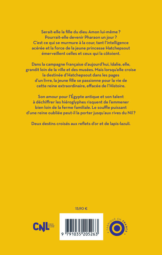 Serait-elle la fille du dieu Amon lui-même ? Pourrait-elle devenir Pharaon un jour ? C'est ce qui se murmure à la cour, tant l'intelligence acérée et la force de la jeune princesse Hatchepsout émerveillent celles et ceux qui la côtoient. Dans la campagne française d'aujourd'hui, Idalie, elle, grandit loin de la ville et des musées. Mais lorsqu'elle croise la destinée d'Hatchepsout dans les pages d'un livre, la jeune fille se passionne pour la vie de cette reine extraordinaire, effacée de l'Histoire. Son amour pour l'Égypte antique et son talent à déchiffrer les hiéroglyphes risquent de l'emmener bien loin de la ferme familiale. Le souffle puissant d'une reine oubliée peut-il la porter jusqu'aux rives du Nil ? Deux destins croisés aux reflets d'or et de lapis-lazuli.