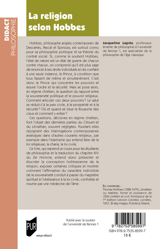 Ce livre, qui reprend un cours pour les étudiants de philosophie et la traduction du chapitre XIV du De Homine, entend présenter et élucider la conception hobbesienne de la religion, exposer certaines critiques et montrer comment l'affirmation du caractère indivisible de la souveraineté conduit à passer du magistère spirituel à l'obéissance à la loi civile, confortée et nourrie par une médecine de l'âme.