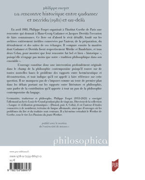 En avril 1981, Philippe Forget organisait à l'Institut Goethe de Paris une rencontre qui donnait à Hans-Georg Gadamer et Jacques Derrida l'occasion de faire connaissance. Ce livre est d'abord le récit détaillé, fondé sur les archives entièrement inédites conservées par l'auteur, de la préparation, du déroulement et des suites de ces échanges. Il compare ensuite la manière dont Gadamer et Derrida lisent respectivement Mörike et Baudelaire, et tous deux Celan, pour montrer que leur rencontre fut bel et bien « historique », puisqu'elle n'engage pas moins que notre « tradition philosophique dans son ensemble ». la philosophie contemporaine du langage.