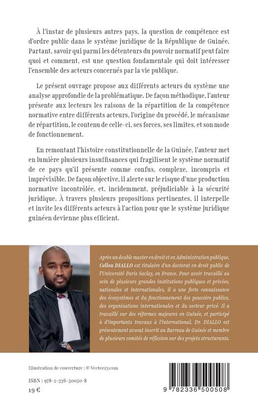 À l'instar de plusieurs autres pays, la question de compétence est d'ordre public dans le système juridique de la République de Guinée. Partant, savoir qui parmi les détenteurs du pouvoir normatif peut faire quoi et comment, est une question fondamentale qui doit intéresser l'ensemble des acteurs concernés par la vie publique. Le présent ouvrage propose aux différents acteurs du système une analyse approfondie de la problématique. De façon méthodique, l'auteur présente aux lecteurs les raisons de la répartition de la compétence normative entre différents acteurs, l'origine du procédé, le mécanisme de répartition, le contenu de celle-ci, ses forces, ses limites, et son mode de fonctionnement. En remontant l'histoire constitutionnelle de la Guinée, l'auteur met en lumière plusieurs insuffisances qui fragilisent le système normatif de ce pays qu'il présente comme confus, complexe, incompris et imprévisible. De façon objective, il alerte sur le risque d'une production normative incontrôlée, et, incidemment, préjudiciable à la sécurité juridique. À travers plusieurs propositions pertinentes, il interpelle et invite les différents acteurs à l'action pour que le système juridique guinéen devienne plus efficient.