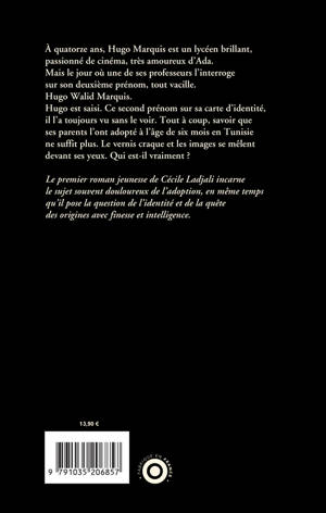 À quatorze ans, Hugo Marquis est un lycéen brillant, passionné de cinéma, très amoureux d'Ada. Mais le jour où une de ses professeurs l'interroge sur son deuxième prénom, tout vacille. Hugo Walid Marquis. Hugo est saisi. Ce second prénom sur sa carte d'identité, il l'a toujours vu sans le voir. Tout à coup, savoir que ses parents l'ont adopté à l'âge de six mois en Tunisie ne suffit plus. Le vernis craque et les images se mêlent devant ses yeux. Qui est-il vraiment ? Le premier roman jeunesse de Cécile Ladjali incarne le sujet souvent douloureux de l'adoption, en même temps qu'il pose la question de l'identité et de la quête des origines avec finesse et intelligence.