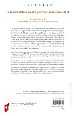 Le volume souligne le rôle joué par la représentation symbolique (rituels, images, cérémoniaux) dans les pratiques politiques et éclaire, à partir d'une large palette d'exemples, les pratiques parlementaires médiévales et modernes et les différentes manières de représenter le peuple, par des procédures inscrites dans la loi ou, au contraire, apparues lors de périodes de révoltes. Il constitue ainsi une invitation à mieux évaluer, par contraste, la signification de la démocratie représentative contemporaine.