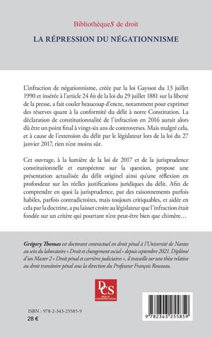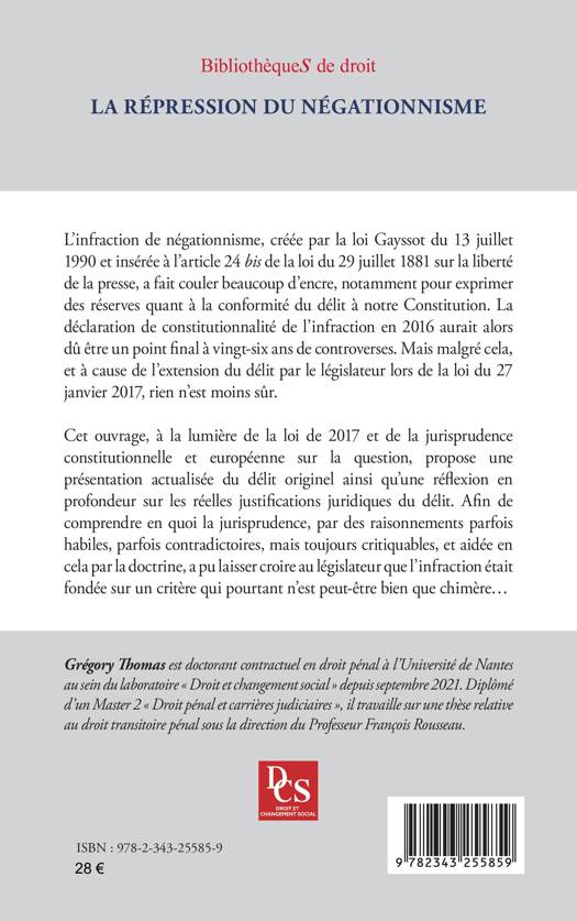 L’infraction de négationnisme, créée par la loi Gayssot du 13 juillet 1990 et insérée à l’article 24 bis de la loi du 29 juillet 1881 sur la liberté de la presse, a fait couler beaucoup d’encre, notamment pour exprimer des réserves quant à la conformité du délit à notre Constitution. La déclaration de constitutionnalité de l’infraction en 2016 aurait alors dû être un point final à vingt-six ans de controverses. Mais malgré cela, et à cause de l’extension du délit par le législateur lors de la loi du 27 janvier 2017, rien n’est moins sûr. Cet ouvrage, à la lumière de la loi de 2017 et de la jurisprudence constitutionnelle et européenne, propose une présentation actualisée du délit originel ainsi qu’une réflexion en profondeur sur les réelles justifications juridiques du délit. Et ce afin de comprendre en quoi la jurisprudence a pu laisser croire au législateur que l’infraction était fondée sur un critère qui pourtant n’est peut-être bien que chimère.