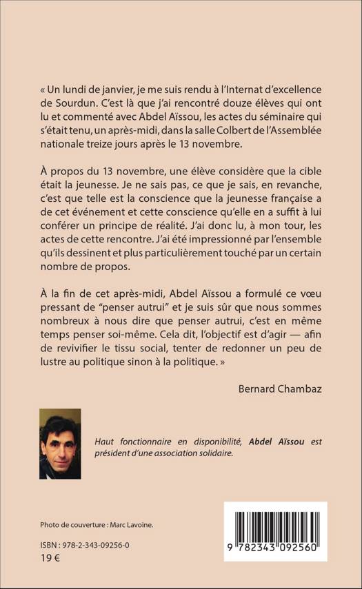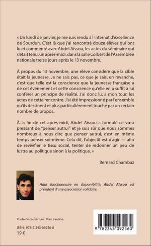 En janvier, douze élèves de l'Internat d'excellence de Sourdun ont lu et commenté avec l'auteur les actes du séminaire qui s'était tenu à l'Assemblée nationale treize jours après les attentats du13 novembre. Ceux-ci ont impacté l'ensemble de la jeunesse française mettant davantage de pesanteur dans leurs vies qui s'esquissent. La gravité des propos de ces jeunes femmes sur l'horreur des attentats et leur lucidité sur leurs conséquences incitent à tenir bon. Ce récit-kaléidoscope est à l'image de notre République et du monde qui l'environne : une mosaïque davantage qu'un miroir lézardé.