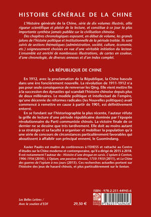 L'Histoire generale de la Chine, serie de dix volumes illustres, allie rigueur scientifique et plaisir de la lecture, et constitue a ce jour la plus importante synthese jamais publiee sur la civilisation chinoise. Des chapitres chronologiques exposent, en debut de volume, les grands jalons de l'histoire politique et institutionnelle de la periode traitee. Ils sont suivis de sections thematiques (administration, vie quotidienne, religion, litterature, economie, etc.) soigneusement choisies en vue d'une veritable initiation du lecteur. L'ensemble est enrichi de nombreuses illustrations, de cartes en couleur, d'une chronologie, de diverses annexes et d'un index complet.