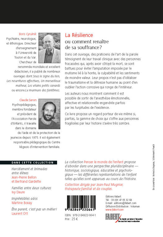 Comment un être humain ayant subi un traumatisme peut-il ensuite retrouver un équilibre lui permettant d'assurer son développement ? Y répondent un certain nombre de personnalités sous la direction de Boris Cyrulnik et Claude Seron. Ce livre propose un regard porteur de vie même si, la gamme de choix qui s'offre aux personnes fragilisées s'avère très sombre.Dans cet ouvrage, des praticiens de l'art de la parole témoignent de leur travail clinique avec des personnes fracassées qui, après avoir côtoyé la mort, se sont battues pour éviter l'amputation imposée par le mutisme lié à la honte, la culpabilité et les sentiments de moindre valeur. Leur propos n'est pas d'idéaliser le traumatisme et la détresse humaine au point d'en oublier l'action corrosive qui ronge de l'intérieur. Le but de ce livre est de comprendre les facteurs qui ont permis à certaines personnes traumatisées non seulement de survivre, mais aussi de construire une nouvelle vie faite de choix et de possibles. Les auteurs nous montrent les moyens de sorti r de l'anesthésie émotionnelle, affective et relationnelle engendrée parfois par les turpitudes de l'existence un regard porteur de vie même si, parfois, la gamme de choix qui s'offre aux personnes fragilisées par leur histoire s'avère très sombre.