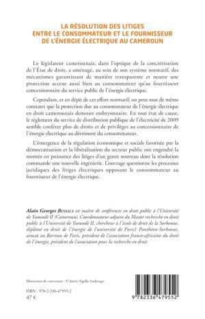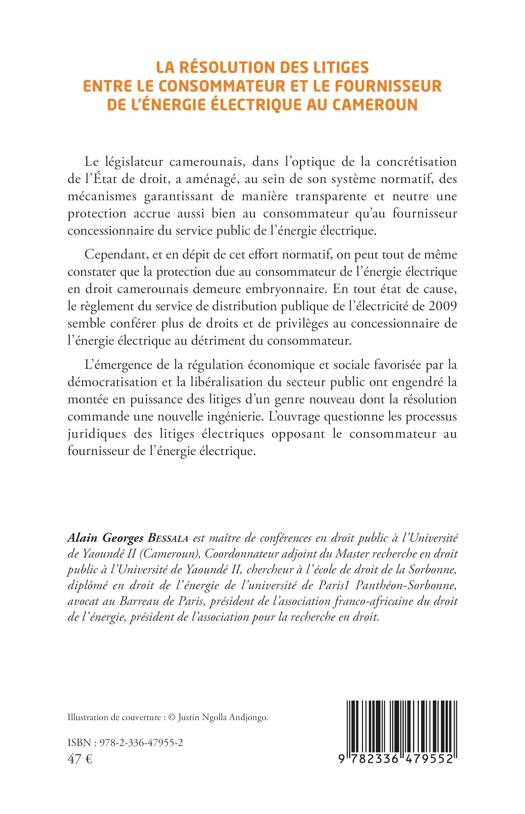 Le législateur camerounais, dans l'optique de la concrétisation de l'État de droit, a aménagé, au sein de son système normatif, des mécanismes garantissant de manière transparente et neutre une protection accrue aussi bien au consommateur qu'au fournisseur concessionnaire du service public de l'énergie électrique. Cependant, et en dépit de cet effort normatif, on peut tout de même constater que la protection due au consommateur de l'énergie électrique en droit camerounais demeure embryonnaire. En tout état de cause, le règlement du service de distribution publique de l'électricité de 2009 semble conférer plus de droits et de privilèges au concessionnaire de l'énergie électrique au détriment du consommateur. L'émergence de la régulation économique et sociale favorisée par la démocratisation et la libéralisation du secteur public ont engendré la montée en puissance des litiges d'un genre nouveau dont la résolution commande une nouvelle ingénierie. L'ouvrage questionne les processus juridiques des litiges électriques opposant le consommateur au fournisseur de l'énergie électrique.