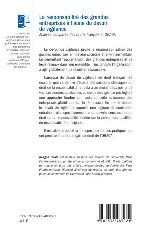 Le devoir de vigilance prône la responsabilisation des grandes entreprises en matière sociétale et environnementale. En permettant l'appréhension des grandes entreprises et de leurs réseaux dans leur ensemble, il incite toute l'organisation à agir globalement de manière responsable. L'analyse du devoir de vigilance en droit français fait ressortir que ce dernier s'écarte des solutions classiques du droit de la responsabilité, et cela à au moins deux points de vue. Les normes applicables au devoir de vigilance privilégient une approche fondée sur l'auto-contrôle autonome des entreprises plutôt que sur la répression. En même temps, le devoir de vigilance apporte une logique de contrainte entraînant plus spécifiquement une nouvelle construction du droit de la responsabilité fondée sur la prévention, qualifiée de responsabilité-anticipation. Il est alors proposé la transposition de ces pratiques qui ont pénétré le droit français en droit de l'OHADA.
