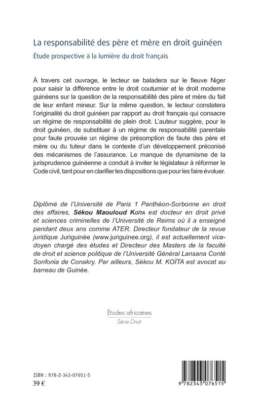 Ce livre aide à saisir la différence entre le droit coutumier et le droit moderne guinéens sur la question de la responsabilité des père et mère du fait de leur enfant mineur. L'auteur suggère de substituer à un régime de responsabilité parentale pour faute prouvée un régime de présomption de faute des père et mère dans le contexte d'un développement préconisé des mécanismes d'assurance. Le manque de dynamisme de la jurisprudence guinéenne a conduit à inviter le législateur à réformer le Code civil, tant pour en clarifier les dispositions que pour les faire évoluer.