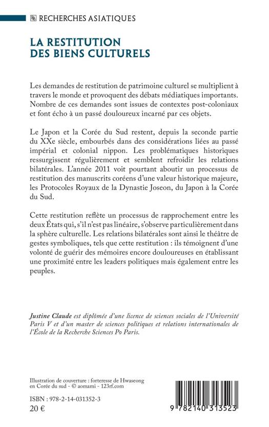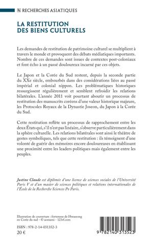 Les demandes de restitution de patrimoine culturel se multiplient à travers le monde et provoquent des débats médiatiques importants. Nombre de ces demandes sont issues de contextes post-coloniaux et font écho à un passé douloureux incarné par ces objets. Le Japon et la Corée du Sud restent, depuis la seconde partie du XXe siècle, embourbés dans des considérations liées au passé impérial et colonial nippon. L'année 2011 voit pourtant aboutir un processus de restitution des manuscrits coréens d'une valeur historique majeure, les Protocoles Royaux de la Dynastie Joseon, du Japon à la Corée du Sud. Les relations bilatérales sont ainsi le théâtre de gestes symboliques, tels que cette restitution: ils témoignent d'une volonté de guérir des mémoires encore douloureuses en établissant une proximité entre les leaders politiques mais également entre les peuples.
