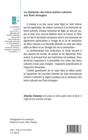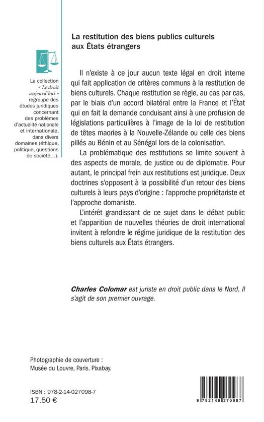 Il n'existe à ce jour aucun texte légal en droit interne qui fait application de critères communs à la restitution de biens culturels. Chaque restitution se règle, au cas par cas, par le biais d'un accord bilatéral entre la France et l'État qui en fait la demande conduisant ainsi à une profusion de législations particulières à l'image de la loi de restitution de têtes maories à la Nouvelle-Zélande ou celle des biens pillés au Bénin et au Sénégal lors de la colonisation. La problématique des restitutions se limite souvent à des aspects de morale, de justice ou de diplomatie. Pour autant, le principal frein aux restitutions est juridique. Deux doctrines s'opposent à la possibilité d'un retour des biens culturels à leurs pays d'origine : l'approche propriétariste et l'approche domaniste. L'intérêt grandissant de ce sujet dans le débat public et l'apparition de nouvelles théories de droit international invitent à refondre le régime juridique de la restitution des biens culturels aux États étrangers.