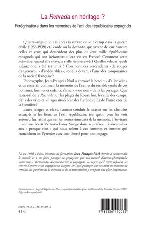 Quatre-vingt-cinq ans après la défaite de leur camp dans la guerre civile (1936-1939) et l’exode ou la Retirada, que savent de leur histoire celles et ceux qui descendent des plus de cent mille républicains espagnols qui ont (re)construit leur vie en France ? Comment cette mémoire, quand elle existe, a-t-elle été préservée ? Quelles valeurs, quels idéaux ont-ils été transmis ? Comment ces descendants « de rouges dangereux », « d’indésirables », sont-ils devenus l’une des composantes de la société française ? Photographe, Jean-François Noël a éprouvé le besoin « d’aller voir » et de ressentir comment la mémoire de l’exil et du terrible exode de ces hommes, femmes et enfants, s’inscrit – ou non – dans les paysages. Que reste-t-il de la Retirada sur les plages du Roussillon, les sites des camps, dans des villes et villages situés loin des Pyrénées ? Et de l’autre côté de la frontière ? Entre images et récits, l’auteur conduit le lecteur sur les chemins escarpés et les lieux de l’exil républicain, tels qu’on peut les voir aujourd’hui, ainsi que sur les routes sinueuses de la mémoire. L’invitant – comme l’écrit Verónica Estay Stange dans sa préface – à s'accrocher aux « presque rien » qui nous relient à ces hommes et femmes qui franchirent les Pyrénées avec leur liberté pour tout bagage.