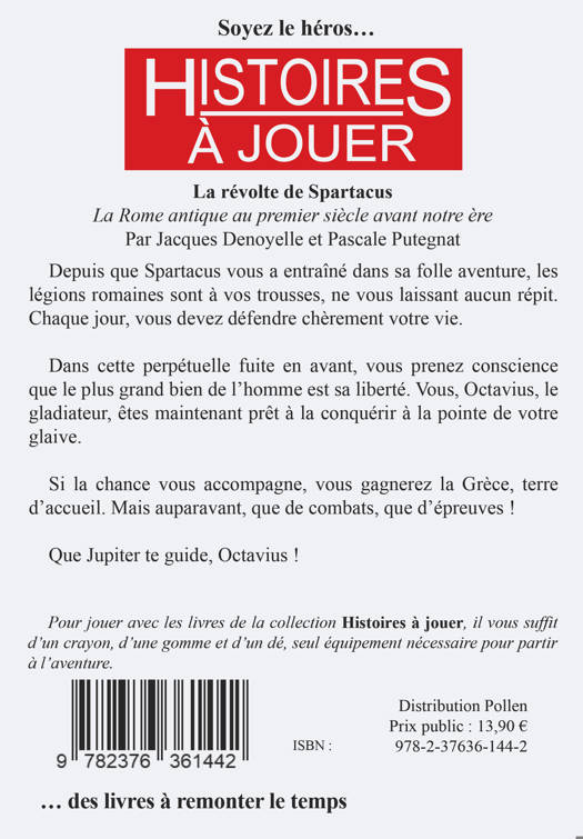 Depuis que Spartacus vous a entraîné dans sa folle aventure, les légions romaines sont à vos trousses, ne vous laissant aucun répit. Chaque jour, vous devez défendre chèrement votre vie. Dans cette perpétuelle fuite en avant, vous prenez conscience que le plus grand bien de l'homme est sa liberté. Vous, Octavius, le gladiateur, êtes maintenant prêt à la conquérir à la pointe de votre glaive. Si la chance vous accompagne, vous gagnerez la Grèce, terre d'accueil. Mais auparavant, que de combats, que d'épreuves ! Que Jupiter te guide, Octavius !