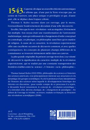 English summary: In this work, the author tells the story of the extraordinary upheaval following Copernicus's discovery that the Earth was not the center of the universe and, further, that it moved within celestial space. This book analyzes the resulting multiple transformations within the fields of mathematical astronomy, cosmology, physics, philosophy, and religion, to highlight just how intertwined these fields have always been. French description: 1543: Copernic divulgue ses nouvelles theories astronomiques et affirme que, d'une part la Terre n'occupe pas, au centre de l'univers, une place unique et privilegiee et que, d'autre part, elle se deplace dans l'espace celeste. Thomas S. Kuhn raconte dans cet ouvrage, par le menu, l'extraordinaire bouleversement decoulant d'une telle decouverte. En effet, bien que le mot revolution soit au singulier, l'evenement fut multiple. Son noyau etait une transformation de l'astronomie mathematique, mais qui embrassait des changements d'ordre conceptuel en cosmologie, en physique, en philosophie aussi bien qu'en matiere de religion. A cause de ce caractere, la revolution copernicienne offre une excellente occasion de decouvrir comment, et avec quelles consequences, les concepts de plusieurs champs differents de la connaissance se trouvent intimement meles dans un canevas. La plus grande originalite du present ouvrage tient donc a sa volonte de decouvrir la signification du caractere multiple de la revolution copernicienne, qui se traduit par une constante transgression des frontieres etablies entre la science , l' histoire ou la philosophie .