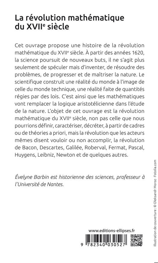 L’objet de cet ouvrage est la révolution mathématique du XVIIe siècle, non pas celle que nous pourrions définir, caractériser, décréter, à partir de cadres ou de théories a priori, mais la révolution que les acteurs mêmes disent vouloir ou non accomplir, la révolution de Bacon, Descartes, Galilée, Roberval, Fermat, Pascal, Huygens, Leibniz, Newton et de quelques autres.