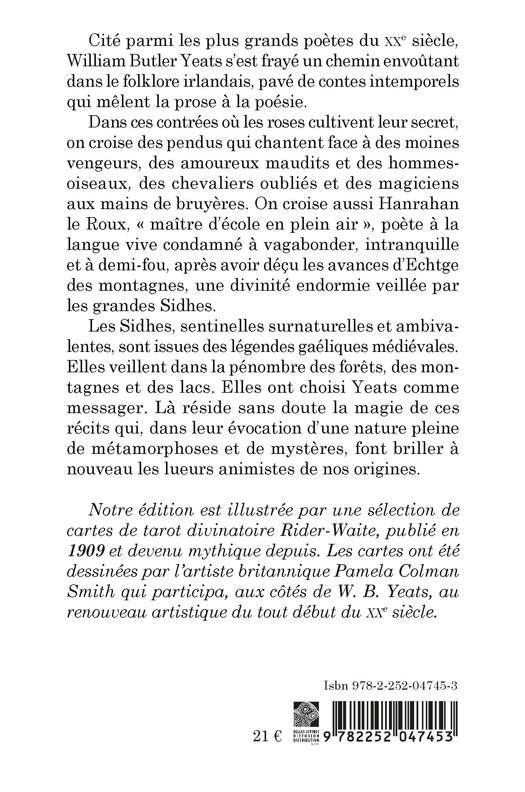 Cite parmi les plus grands poetes du XXe siecle, William Butler Yeats s'est fraye un chemin envoutant dans le folklore irlandais, pave de contes intemporels qui melent la prose a la poesie. Dans ces contrees ou les roses cultivent leur secret, on croise des pendus qui chantent face a des moines vengeurs, des amoureux maudits et des hommes-oiseaux, des chevaliers oublies et des magiciens aux mains de bruyeres. On croise aussi Hanrahan le Roux, maitre d'ecole en plein air , poete a la langue vive condamne a vagabonder, intranquille et a demi-fou, apres avoir decu les avances d'Echtge des montagnes, une divinite endormie veillee par les grandes Sidhes. Les Sidhes, sentinelles surnaturelles et ambivalentes, sont issues des legendes gaeliques medievales. Elles veillent dans la penombre des forets, des montagnes et des lacs. Elles ont choisi Yeats comme messager. La reside sans doute la magie de ces recits qui, dans leur evocation d'une nature pleine de metamorphoses et de mysteres, font briller a nouveau les lueurs animistes de nos origines. Notre edition est illustree par une selection de cartes de tarot divinatoire Rider-Waite, publie en 1909 et devenu mythique depuis. Les cartes ont ete dessinees par l'artiste britannique Pamela Colman Smith qui participa, aux cotes de W. B. Yeats, au renouveau artistique du tout debut du XXe siecle.