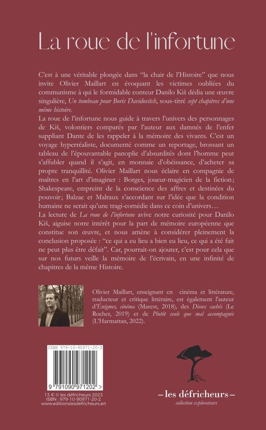 C'est à une véritable plongée dans la chair de l'Histoire que nous invite Olivier Maillart en évoquant les victimes oubliées du communisme à qui le formidable conteur Danilo Kis dédia une oeuvre singulière, Un tombeau pour Boris Davidovitch, sous-titré sept chapitres d'une même histoire. a roue de l'infortune nous guide à travers l'univers des personnages de Kis, volontiers comparés par l'auteur aux damnés de l'enfer suppliant Dante de les rappeler à la mémoire des vivants. C'est un voyage hyperréaliste, documenté comme un reportage, brossant un tableau de l'épouvantable panoplie d'absurdités dont l'homme peut s'affubler quand il s'agit, en monnaie d'obéissance, d'acheter sa propre tranquillité. Olivier Maillart nous éclaire en compagnie de maîtres en l'art d'imaginer : Borges, joueur-magicien de la fiction ; Shakespeare, empreint de la conscience des affres et destinées du pouvoir ; Balzac et Malraux s'accordant sur l'idée que la condition humaine ne serait qu'une tragi-comédie dans ce coin d'univers... La lecture de La roue de l'infortune avive notre curiosité pour Danilo Kis, aiguise notre intérêt pour la part de mémoire européenne que constitue son oeuvre, et nous amène à considérer pleinement la conclusion proposée : ce qui a eu lieu a bien eu lieu, ce qui a été fait ne peut plus être défait . Car, pourrait-on ajouter, c'est pour cela que sur nos futurs veille la mémoire de l'écrivain, en une infinité de chapitres de la même Histoire.