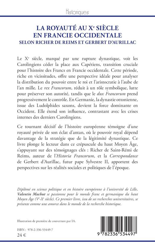 Le Xe siècle, marqué par une rupture dynastique, voit les Carolingiens céder la place aux Capétiens, transition cruciale pour l'histoire des Francs en Francie occidentale. Cette période, riche en vicissitudes, offre une perspective idéale pour analyser la distribution du pouvoir entre le roi et l'aristocratie à l'aube de l'an mille. Le rex Francorum, réduit à un rôle symbolique, lutte pour préserver son autorité, tandis que le dux Francorum prend progressivement le contrôle. En Germanie, la dynastie ottonienne, issue des Ludolphides saxons, devient la force dominante en Occident. Elle étend son influence, contrastant avec les crises internes des derniers Carolingiens. Ce tournant décisif de l'histoire européenne témoigne d'une royauté privée de son éclat d'antan, où le pouvoir royal dépend davantage de la stratégie que de la légitimité dynastique. Ce livre plonge le lecteur dans ce crépuscule du haut Moyen Âge, s'appuyant sur des témoignages clés: Richer de Saint-Rémi de Reims, auteur de l'Historia Francorum, et la Correspondance de Gerbert d'Aurillac, futur pape Sylvestre II, apportent des perspectives sur les réalités sociales et politiques de l'époque.