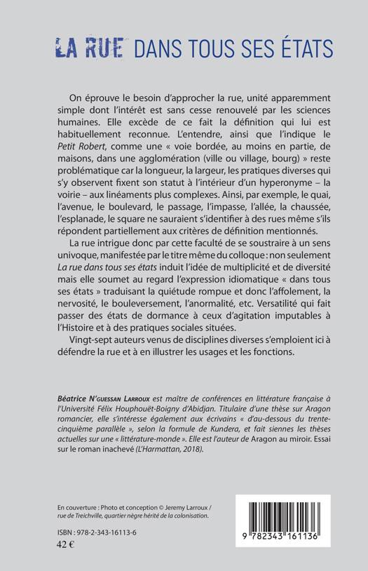 On éprouve le besoin d'approcher la rue, unité apparemment simple dont l'intérêt est sans cesse renouvelé par les sciences humaines. La rue intrigue par cette faculté de se soustraire à un sens univoque, manifestée par le titre même du colloque : non seulement la rue dans tous ses états induit l'idée de multiplicité et de diversité mais elle soumet au regard l'expression idiomatique « dans tous ses états » traduisant la quiétude rompue et donc l'affolement, la nervosité, le bouleversement, l'anormalité, etc. Versatilité qui fait passer des états de dormance à ceux d'agitation imputables à l'Histoire et à des pratiques sociales situées. Vingt-sept auteurs venus de disciplines diverses s'emploient ici à défendre la rue et à en illustrer les usages et les fonctions.