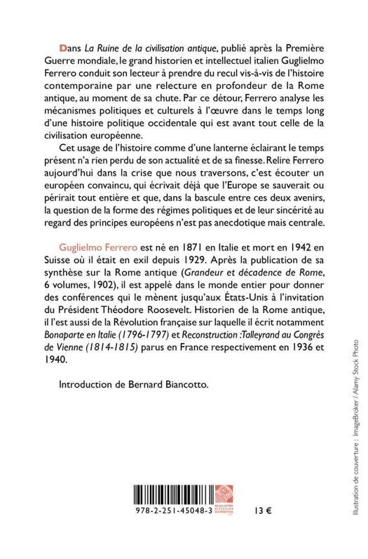 Dans La Ruine de la civilisation antique, publie apres la Premiere Guerre mondiale, le grand historien et intellectuel italien Guglielmo Ferrero conduit son lecteur a prendre du recul vis-a-vis de l'histoire contemporaine par une relecture en profondeur de la Rome antique, au moment de sa chute. Par ce detour, Ferrero analyse les mecanismes politiques et culturels a l'oeuvre dans le temps long d'une histoire politique occidentale qui est avant tout celle de la civilisation europeenne. Cet usage de l'histoire comme d'une lanterne eclairant le temps present n'a rien perdu de son actualite et de sa finesse. Relire Ferrero aujourd'hui dans la crise que nous traversons, c'est ecouter un europeen convaincu, qui ecrivait deja que l'Europe se sauverait ou perirait tout entiere et que, dans la bascule entre ces deux avenirs, la question de la forme des regimes politiques et de leur sincerite au regard des principes europeens n'est pas anecdotique mais centrale.